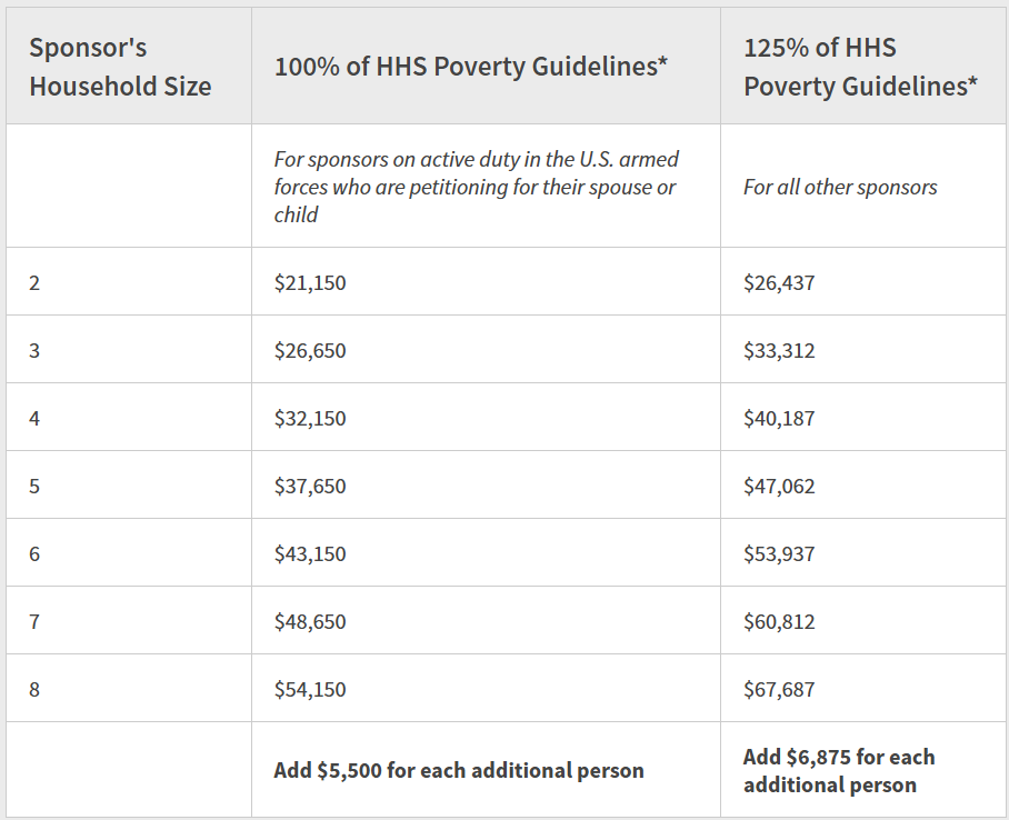 Se o sponsor for militar ativo das Forças Armadas dos Estados Unidos e estiver patrocinando cônjuge ou filho, a exigência pode ser reduzida para 100% da linha de pobreza federal, em determinados casos.